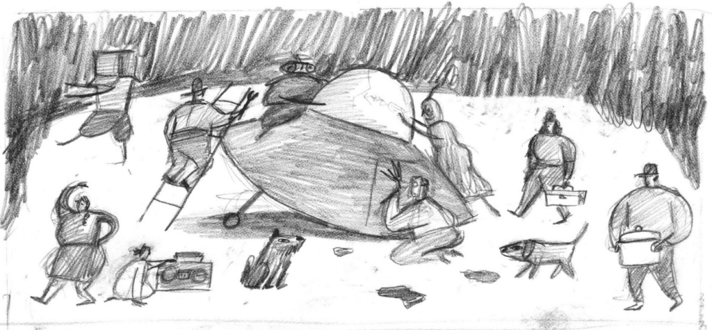 When I was still figuring out the story, I sketched the three visitors in various scenarios and asked myself, “How should the townspeople react?”