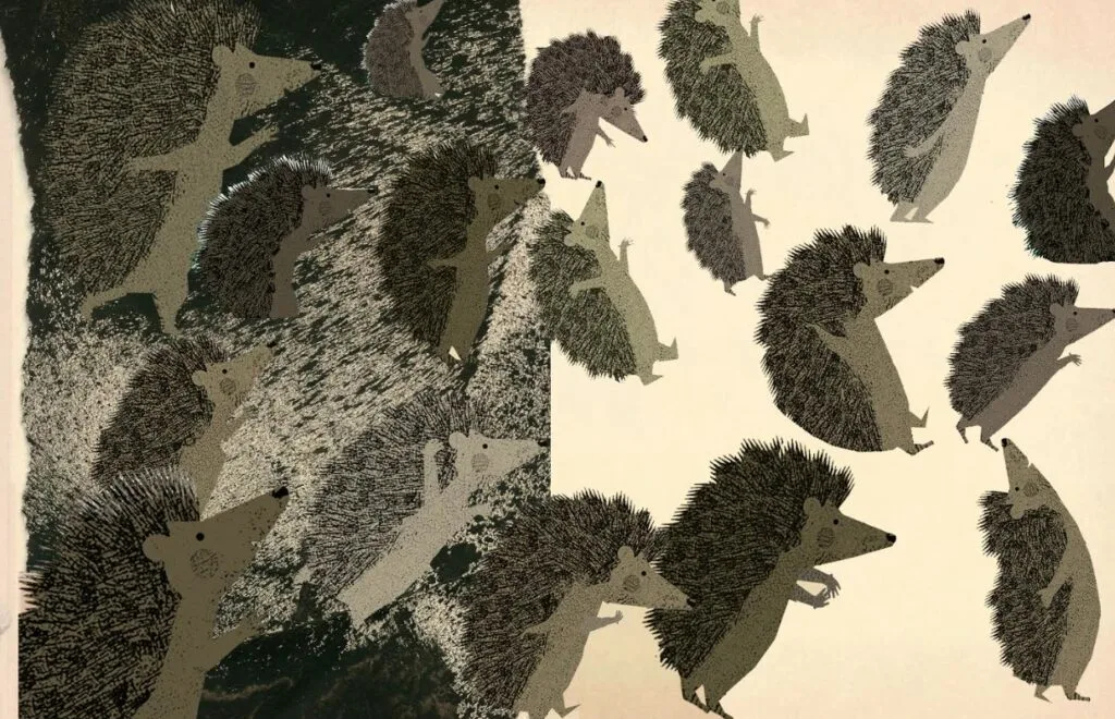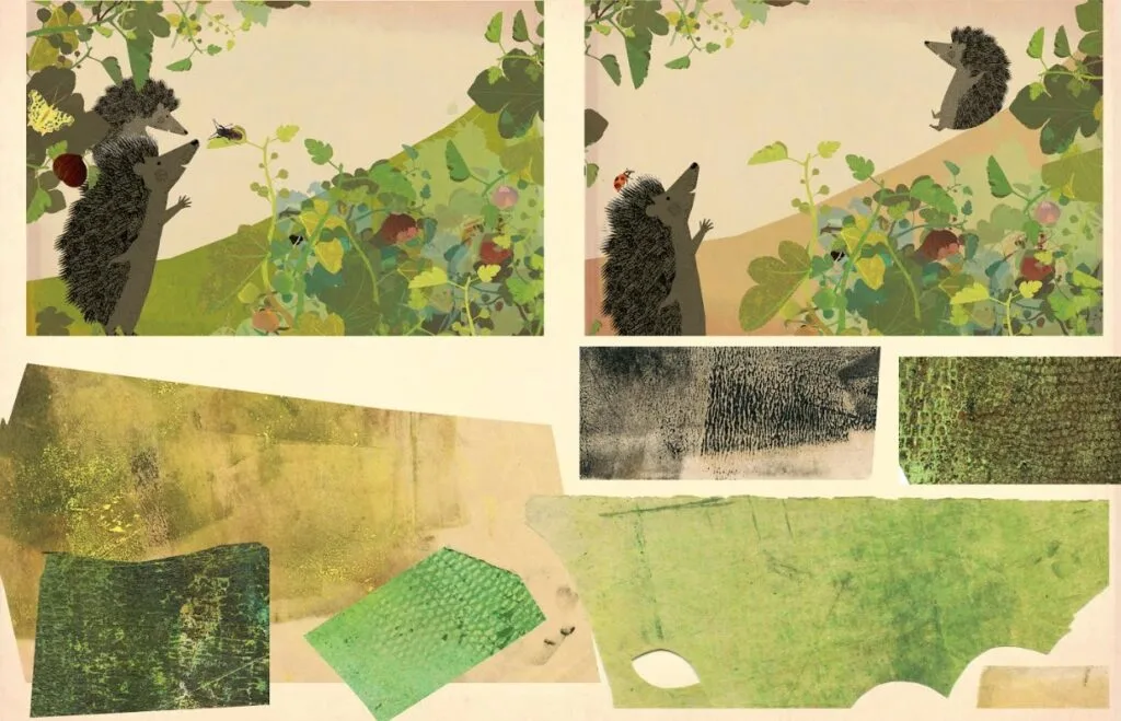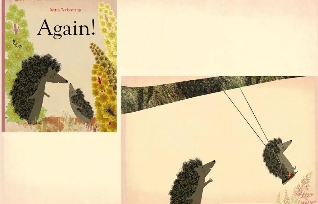 ‘Again’ is the latest adventure of Big Hedgehog and Little Hedgehog. They have just woken up from their winter’s sleep and are both excited to re-join the world. Little Hedgehog is full of energy because spring has finally sprung and wants to explore the world and try out everything – again and again!