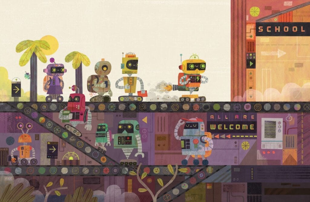 This is such a difficult one to answer, because Jacob Souva absolutely nailed the illustrations in this story. But since I have to pick, I’m going to say the very first 2-page spread, because it was my very first glimpse into a world I helped create. When I wrote the original manuscript, my opening line simply said, “Whirby the robot loved going to robot school.” Jacob took this generic statement and created an entire believable world. I audibly gasped when I saw it: This is EXACTLY what a robot school should look like! The gears, the conveyor belt, the puffs of smoke. The textures and colors and teeny tiny details. And Whirby himself, whizzing by with his jetpack backpack! I was just instantly in love and inspired. I truly believe this is going to be one of the most beautiful books on the shelf!